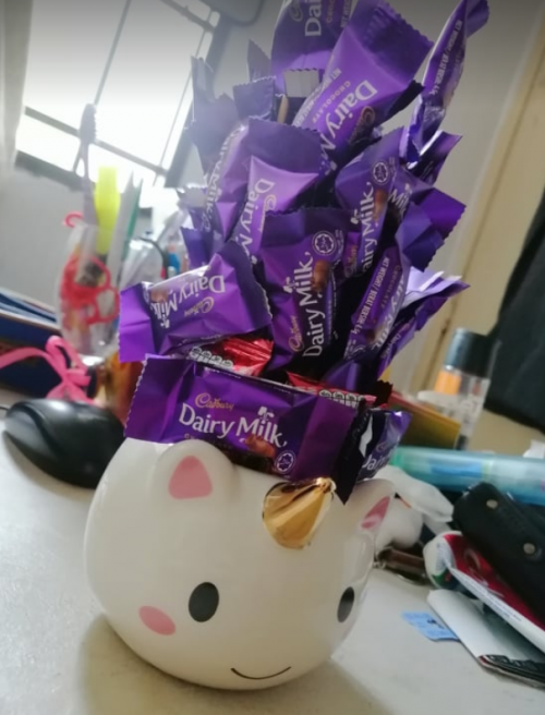 made a chocolate tower with a unicorn mug that you can get from kaison |