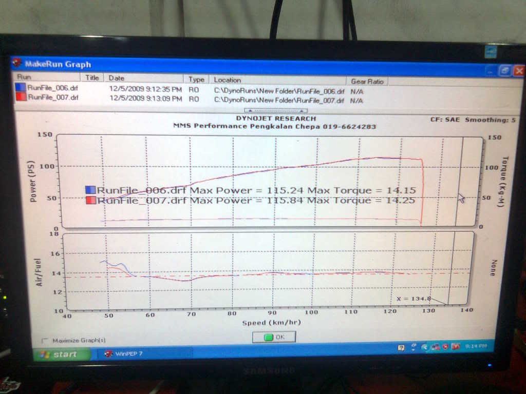 QUOTE(sphiroth @ Dec 5 2009, 10:30 PM) RM100.. At first for 3 run they said.. But i can see at least 7 (001-007) file they save in the com.. Can't print, printer kong... Hak3.. So take it with my sister phone...QUOTE(sphiroth @ Dec 5 2009, 11:19 PM) Yeah, the max power is around that (the same also mentioned in the spec) which I think is quite weird, usually power will kept climbing while torque may have drop. At 3rd gear.. Dyno are done in 1 gear, usually 3rd gear for MT. Added on December 5, 2009, 11:22 pmMy dyno shows the power drop after 6.5k rpm QUOTE(eastwest @ Dec 5 2009, 11:33 PM) 150 ekk... QUOTE(sphiroth @ Dec 5 2009, 11:42 PM) QUOTE(sphiroth @ Dec 6 2009, 12:51 AM) QUOTE(ahpaul82 @ Dec 6 2009, 12:58 AM) Stock CPS? Not really stock.. Very little mod.. Showed at my signature... what is your mod? |