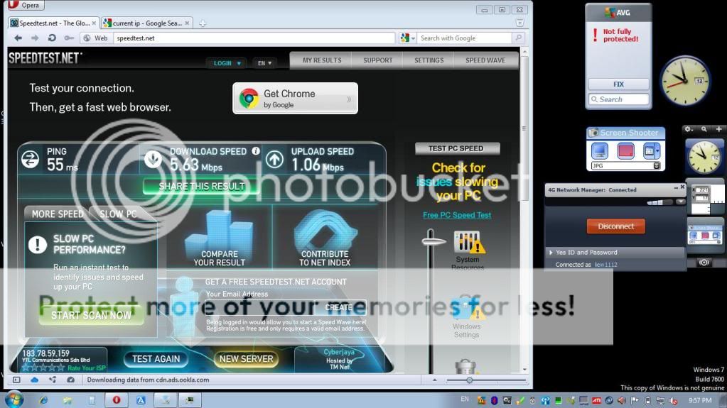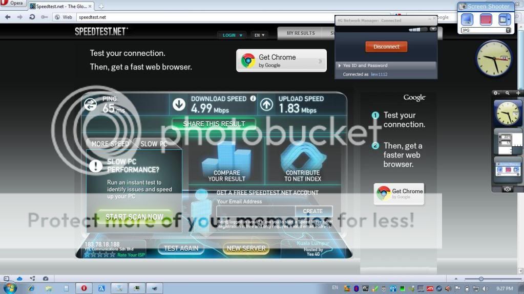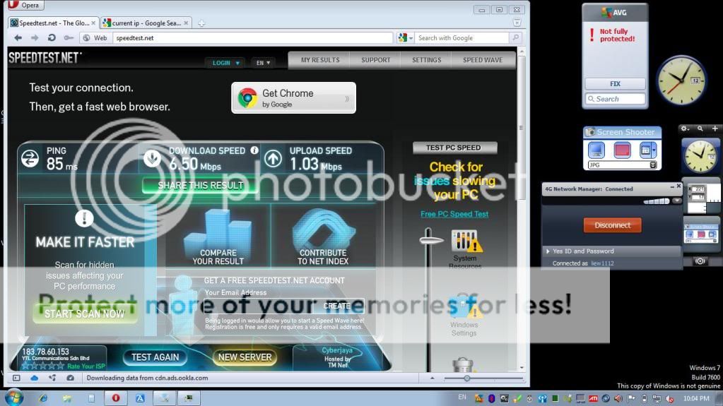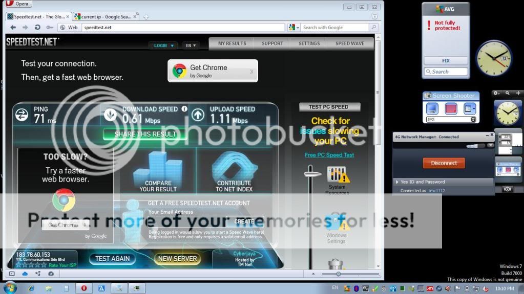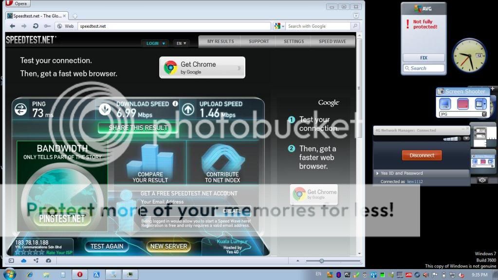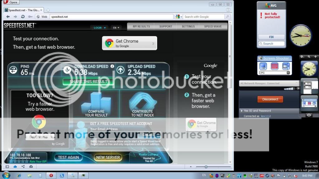 I did some test with my "yes go" yesterday (2011-11-12), on my way from Pudu Raya bus station, Kuala Lumpur to Seremban, by bus. I want to know how was the coverage on the KL-Seremban highway. The results are better than I have expected. Below are the screen shot of my test. The bus usually run at around 120km/h. The connection drop around 15 times on the whole journey, where there are no signal available in between coverage gap. However it get connected within 10 to 30 second most of the time, that means the signal gap is around 300m to 1km. When the bus reach Seremban toll, the connection drop, because the bus was moving slow and the coverage there are very weak. The signal came back stable after leaving toll about 500 meters. When you look at the screen shot below, please beware the time of my widget are not correct sometimes, the window's time at the bottom right corner are the correct one. I hope someone else can test the other parts of highway to let us know the coverage of Yes broadband. 9:24pm Bus just came out from Pudu Raya bus station9:27pm Bus reach Central Market, below the LRT railway9:pm30 Bus pass by Railway Station9:35pm bus pass by jalan lapangan terbang lama9:38pm bus pass by Nirvana Building9:41pm bus pass by petronas station before the KL-Seremban toll9:43pm bus pass by KL-Seremban Toll, traffic are smooth at that time. 9:51pm9:55pm9:57pm10:01pm10:04pm10:10pm10:11pm10:15pm bus leaving Seremban toll10:17pm10:19pm bus reach Terminal One bus station, SerembanThis post has been edited by titan0810: Nov 13 2011, 01:46 AM