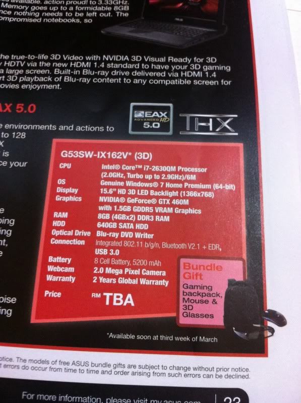 QUOTE(Revamperz @ Mar 15 2011, 07:43 PM) went to asus oulet for some sight seing lol n the saleperson gave me the asus booklet.. Why people still import G73Jh when Asus MY offer it here? http://i218.photobucket.com/albums/cc306/r...z2/f88031ad.jpg i saw this n i ask him. only the price is announce on third week of march the stocks arrival he oso dunno so asus malaysia going to bring this in? no need hot imports? |