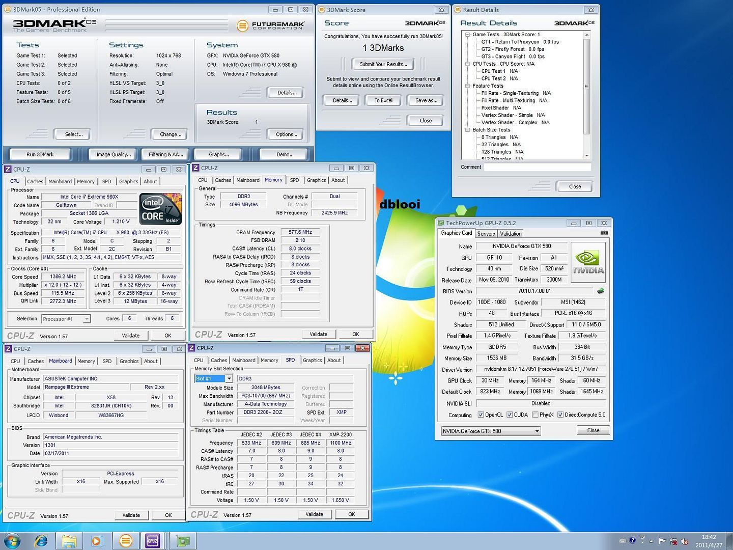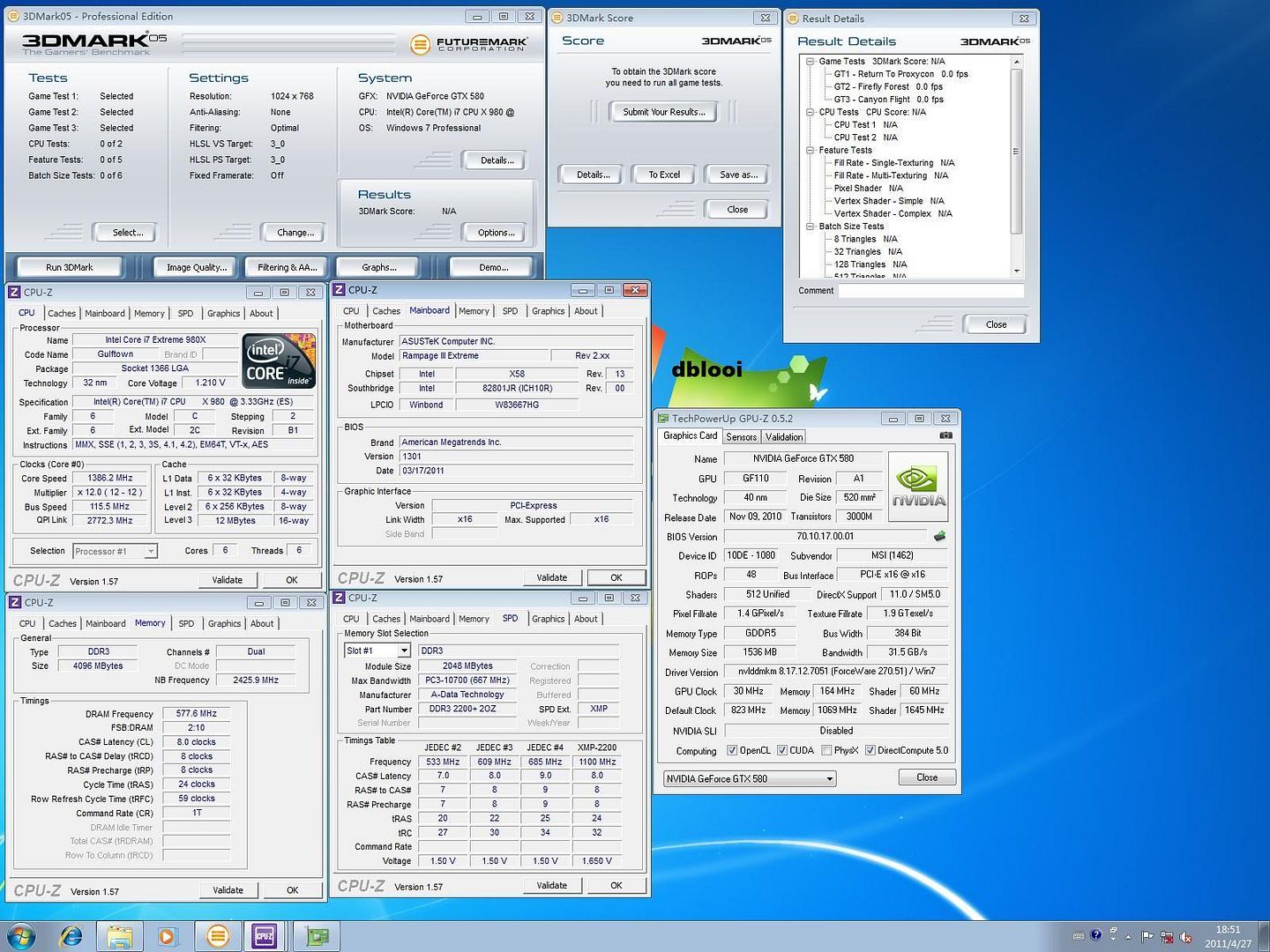 1 @ 1.39GHz | 3DMark05 | dblooi | Win7 32bit Ultimate | Asus Rampage III Extreme | Intel Core i7 Extreme 980X | 115 x 12 | 2 x 2GB ADATA XPG+V2 2200 CL8 | DDR1155 8-8-8-24-1T | MSI GTX580 @ 30/164/60