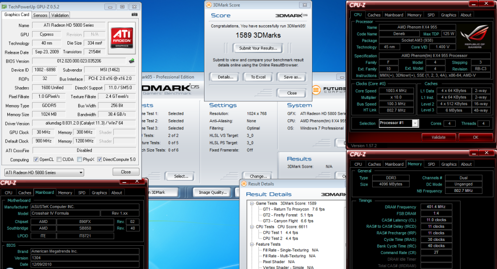 1589 @ 1.003GHz | 3DMark05 | r3m0t3 | Win 7 x64 Professional | ASUS Crosshair IV Formula | AMD Phenom II x4 955BE | 100 x 10 | 2 x 2GB Kingston Hyperx 1600Mhz XMP | DDR800 11-11-11-30-2T | MSI R5870 Lightning @ 30/300
