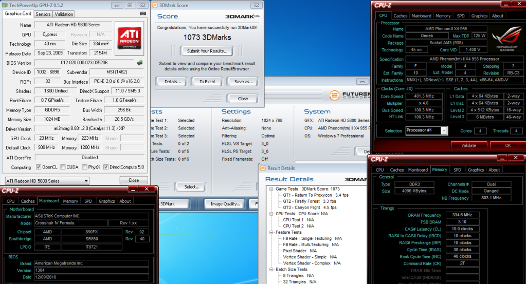 1073 @ 400MHz | 3DMark05 | r3m0t3 | Win 7 x64 Pro | ASUS Crosshair IV Formula | AMD Phenom II x4 955BE | 100 x 4 | 2 x 2GB Kingston HyperX 1600Mhz XMP | DDR666 10-10-10-30-2T | MSI R5870 Lightning @ 23/223
