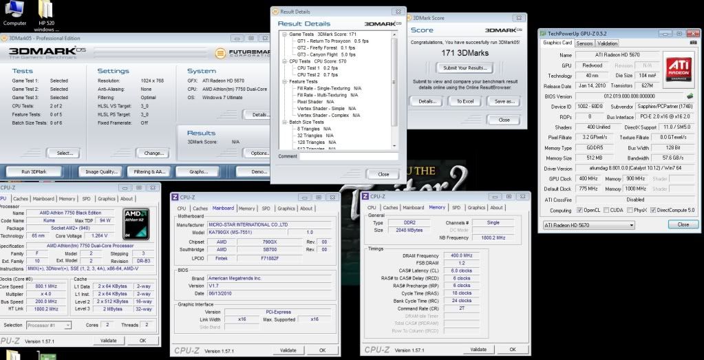 171 @ 0.8Ghz | 3DMark05 | kelvinchen | Win 7 64bit Ultimate | MSI KA790GX-M | AMD Athlon 7750 BE | 200 x 4 | 1 x 2GB Kingston Value RAM 800mhz CL6 | DDR2 800 6-6-6-18-24 2T | Sapphire HD5670 @ 400/900