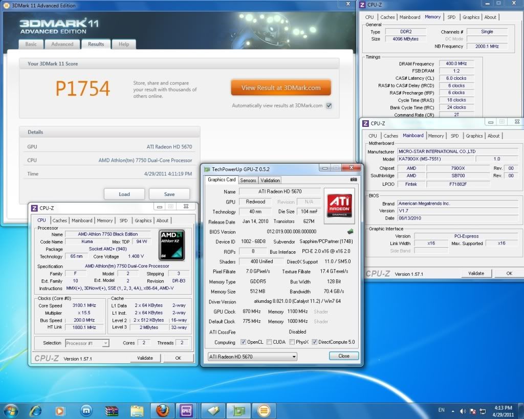 kelvinchen @ 584.6667 (Unofficial)1754 @ 3.100GHz | 3DMark11 | kelvinchen | Win 7 64bit Ultimate | MSI KA790GX-M | AMD Athlon 7750 BE | 200 x 15.5 | 2 x 2GB Kingston Value RAM 800mhz CL6 | DDR2 800 6-6-6-18-24 2T | Sapphire HD5670 @ 870/1100