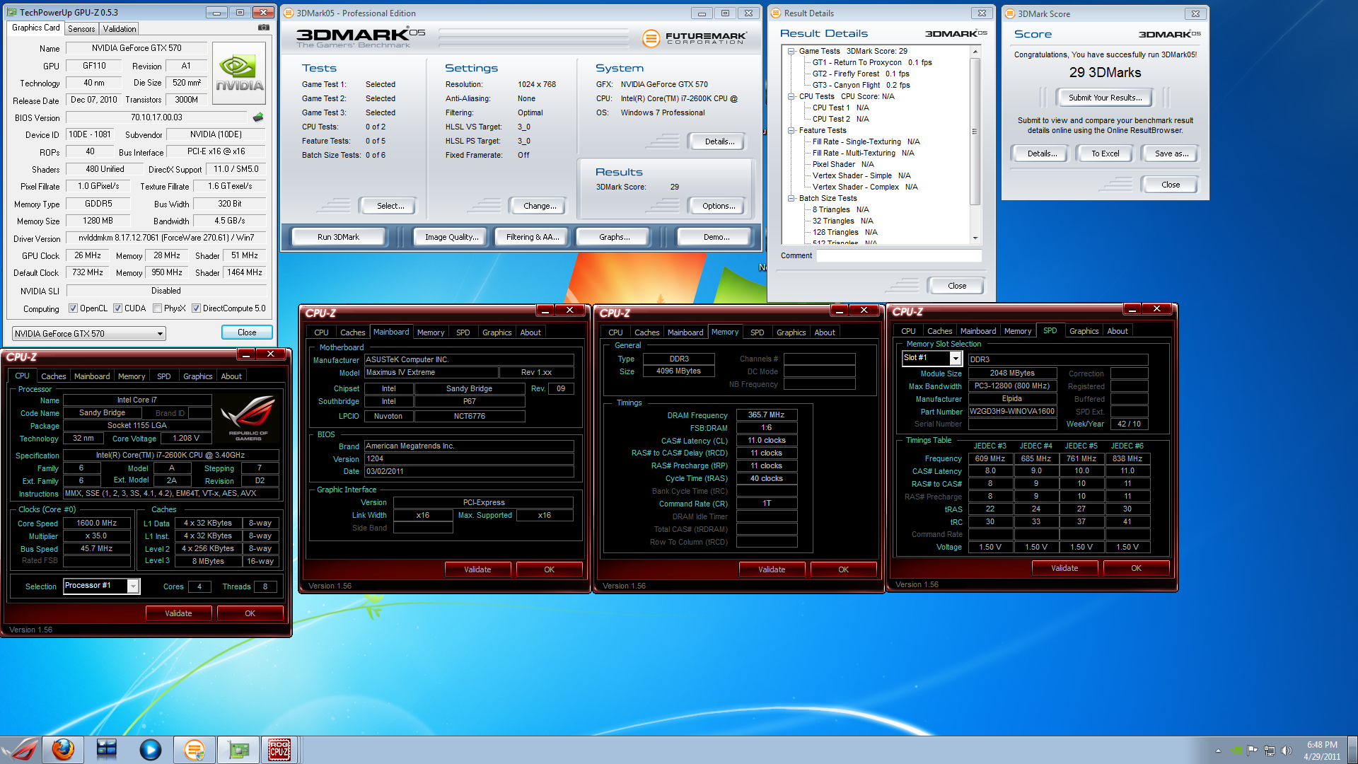 29 @ 1.6GHz | 3DMark05 | jungle_boy | Win7 32bit Pro | Asus Maximus 4 Extreme | I7 2600k | 35 x 45.7 | 2 x 2GB Winova 1600 CAS9 | DDR800 11-11-11-40-1T | MSI GTX570 @ 26/28/51