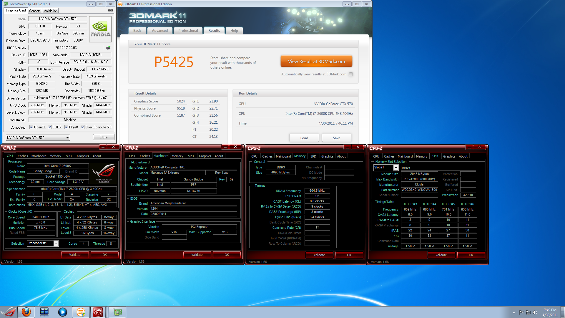 jungle_boy @ 187.06 (Unofficial)5425 @ 3.4GHz | 3DMark11 | jungle_boy | Win7 32bit Pro | Asus Maximus 4 Extreme | I7 2600k | 45 x 75.6 | 2 x 2GB Winova 1600 CAS9 | DDR1600 8-9-8-24-1T | MSI GTX570 @ 732/950/1464