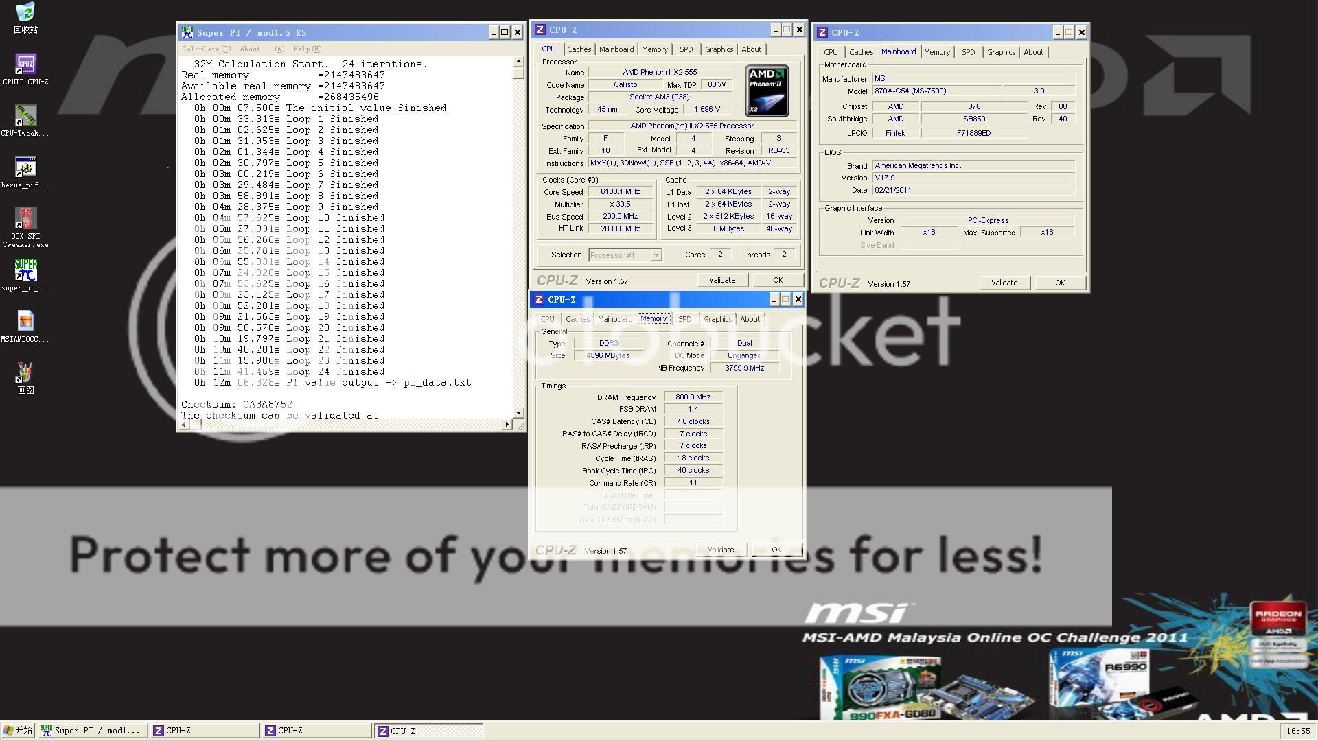 16m 59.290s @ 4.125MHz | Super Pi 32M | uzer85| Win 7 32bit Ultimate | MSI 890GXM-G65 | AMD Phenom II x6 1090T | 250 x 16.5 | 2 x 2GB Corsair XMS3 1600Mhz | DDR1666 7-7-7-20-1T |