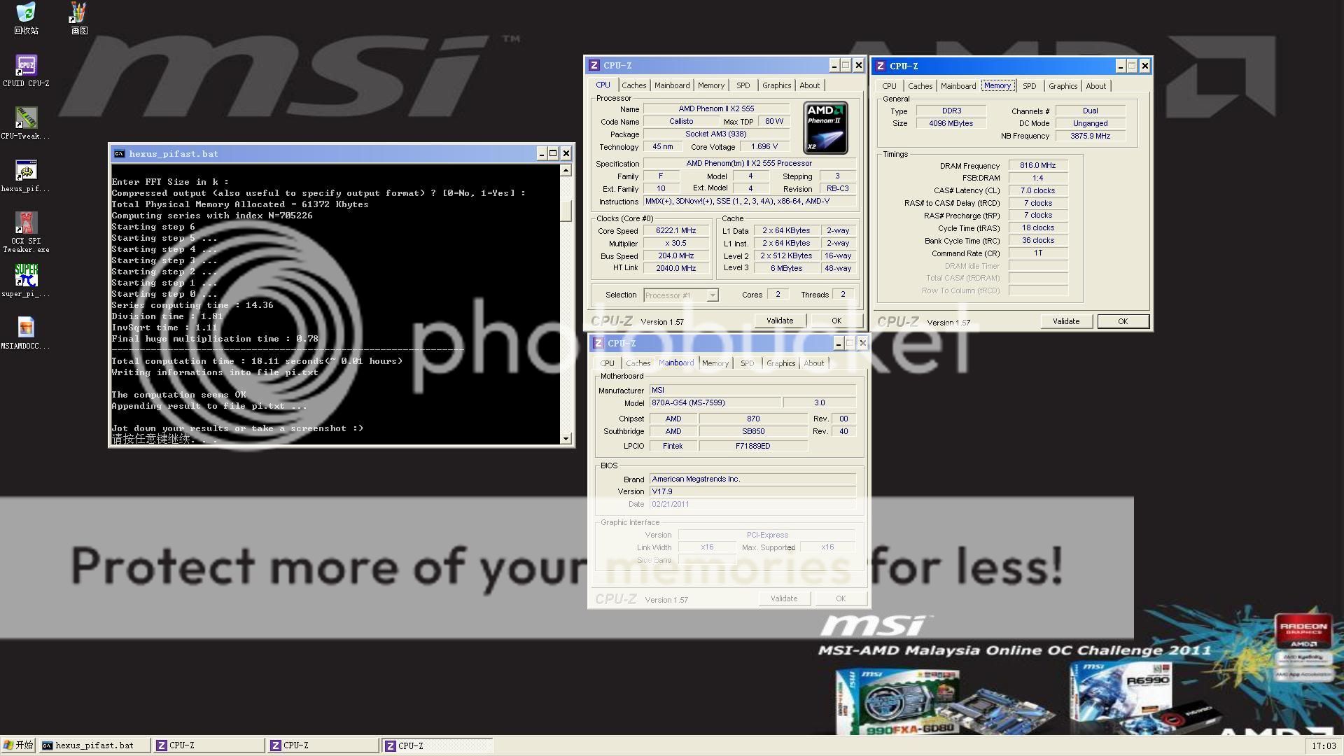 PiFast18.11 @ 6.22GHz | PiFast | kuntawakaw | Win XP 32 | MSI 870A-G54 | AMD Phenom II x2 555BE | 204 x 30.5 | 2 x 2GB Winova Xtune 1600mhz | DDR1636 7-7-7-18-1T |
