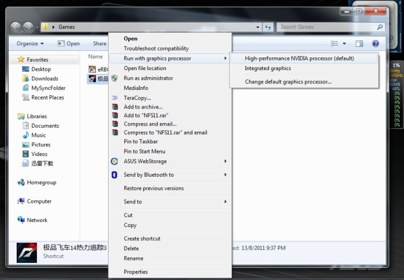 QUOTE(Duckies @ Aug 14 2011, 10:10 PM) Eh guys,there's 2 graphic card in N55SF and N53SV?Intel 3000 and GTX 540/555?How to switch between them? QUOTE(AlexLai @ Aug 14 2011, 10:11 PM) actually ur windows do have something like this:![]() that lets u to force select which card to use when launching a game or app. |
