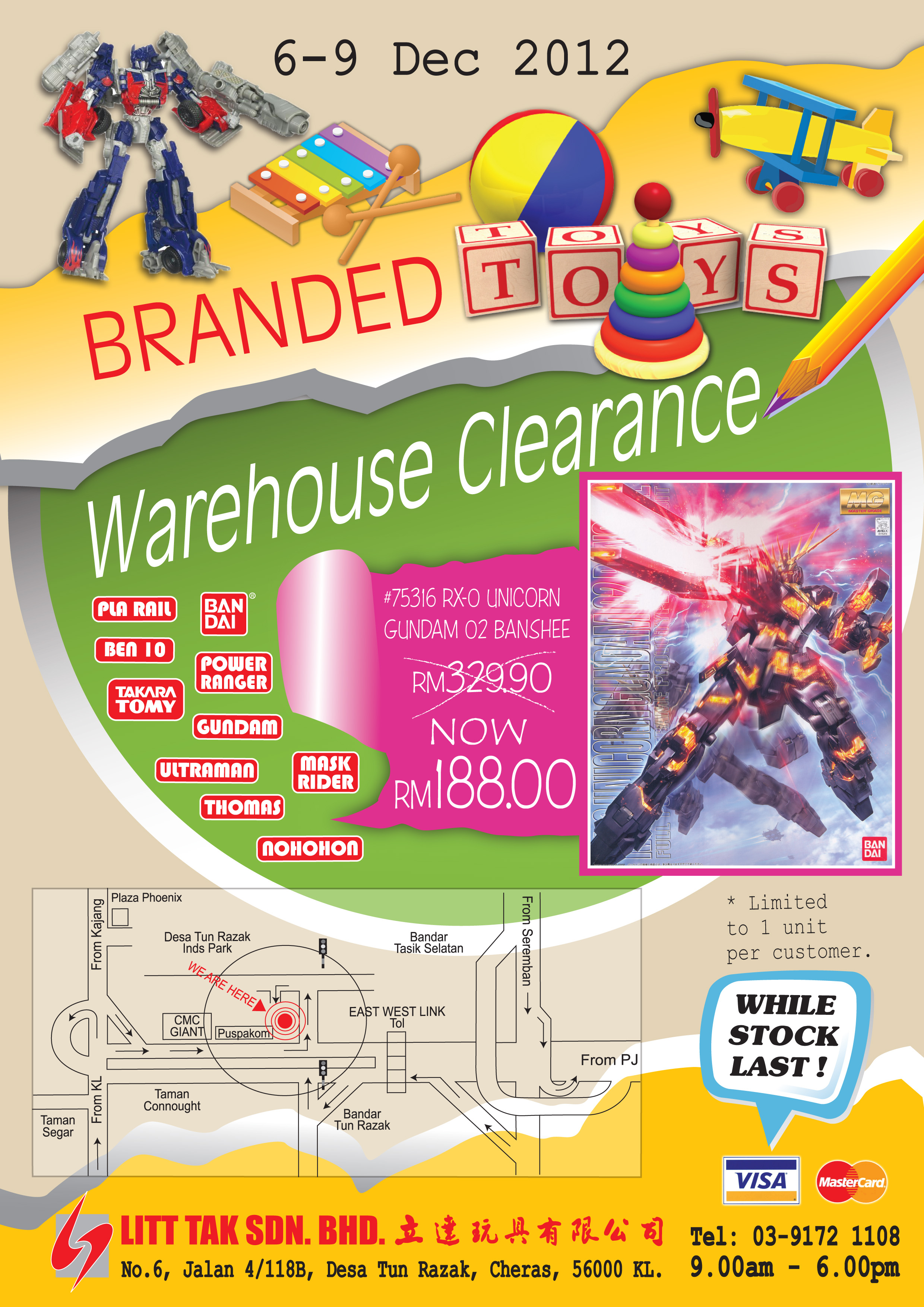 QUOTE(sai86 @ Nov 29 2012, 04:59 PM) First Week of December ~ is not this weekend.. =,= Anyway.. it will be held @ LITTAK warehouse... dunno where to find it.. go google map find Litt Tak Sdn Bhd.. somewhere at bandar tun razak!.. They not just sell Gunpla.. they sell toys also.. and also if lucky.. u may find cheap soft toys.. |