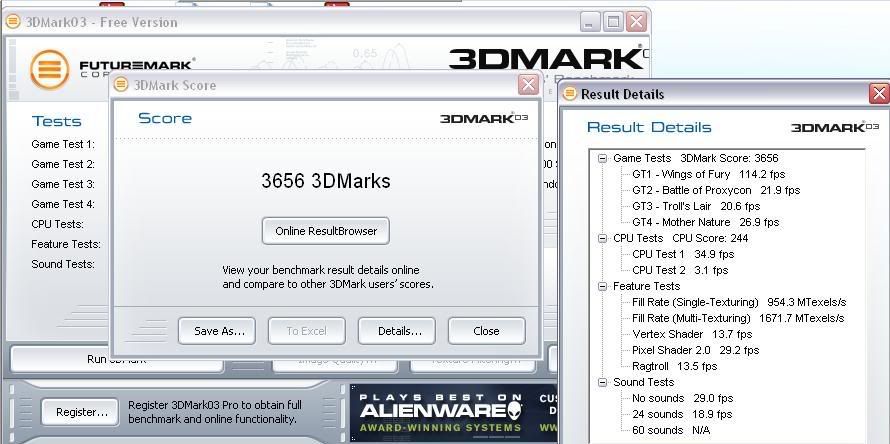 QUOTE(mADmAN @ Jul 13 2007, 11:20 PM) 3dmark03 is not a CPU dependant benchmark la bro.. the cpu only affects a little... Really? I thought 3D Mark 03 depend on cpu also...not like 3dmark06 did u submit ur ORB and tried to compare with other systems similar to urs? Maybe my GC not enough voltage due too many fan i used.. BTW,i'm not yet submit my result to ORB... Don't think it will be benefit.. |