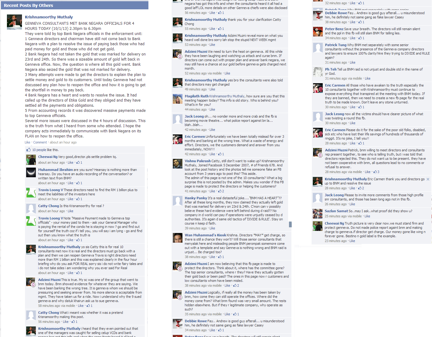 I no longer want to "touch" Dee Casey, very tired one u know getting banned. Where is Savana Sim? started to feel bored and Dee Casey cannot handle the situation alone anymore. hehehe Gold Haven As I understand from what Uncle Yeap said, the IO told him that the police will merely take down the reports and statements and forward all of them back to BNM since it's under BNM's jurisdiction. Please correct me if I'm wrong. 40 minutes ago · Like Dee Casey Good point. From my understanding, police reports made by citizens at PDRM are entirely separate from reports made at BNM. They have separate jurisdictions at most times but there are instances where sometimes they do share overlapping jurisdiction too. For every report involving another department, PDRM do send the relevant report over for that dept to investigate too. But that is besides the point. The point is and you can imagine too, what it is like when you have 60,000+ police reports being referred back to BNM for their internal investigation? The issue we are trying to make is not so much getting the culprits handcuffed, it is more towards getting BNM to try not to sweep things under the carpet because we have already put our case on record with PDRM.  i thought 90% has physical gold? then how come all 60k can file report? This post has been edited by debbierowe: Jan 11 2013, 01:00 PM