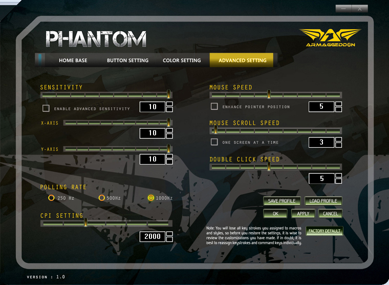 Finally, we have the advanced setting tab that will allow you to set the mouse sensitivity, speed, scroll speed, double click speed, polling rate, axis and the CPI settings.