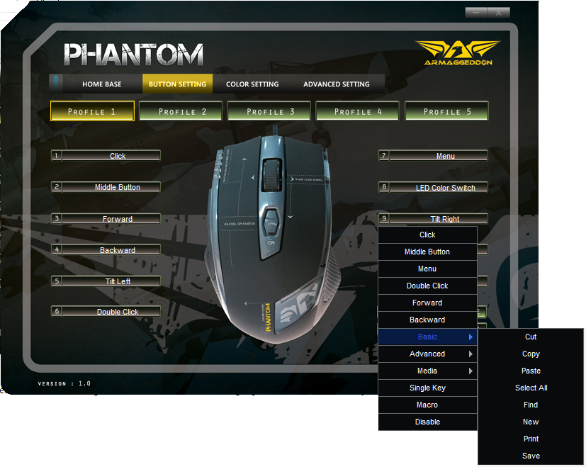 The second screen is the button settings. Here users will be able to assign specific commands to every button on the mouse. Just mouse-over to any of the drop-down menus on the sides and it will indicate the corresponding button that you're able to change. There are lots of commands that you could assign to each of the buttons which includes your normal cut, copy & paste to macros plus the option to disable the said button should you desire. After customising your Phantom, you could save it as one of the 5 profiles into the Phantom; that way you could bring these settings with you into your next LAN party without having to install the software suite. The factory default button will wipe all your customised settings so do be careful not to accidentally press it.