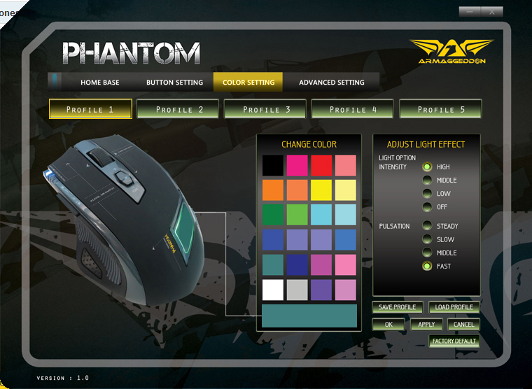 The colour settings tab lets you... erm... set colours to each of the profiles. You could also adjust the lighting intensity and the pulsating effects but there is only 24 colours to choose from not that it matters since you will not be able to see much of the mouse while using it.