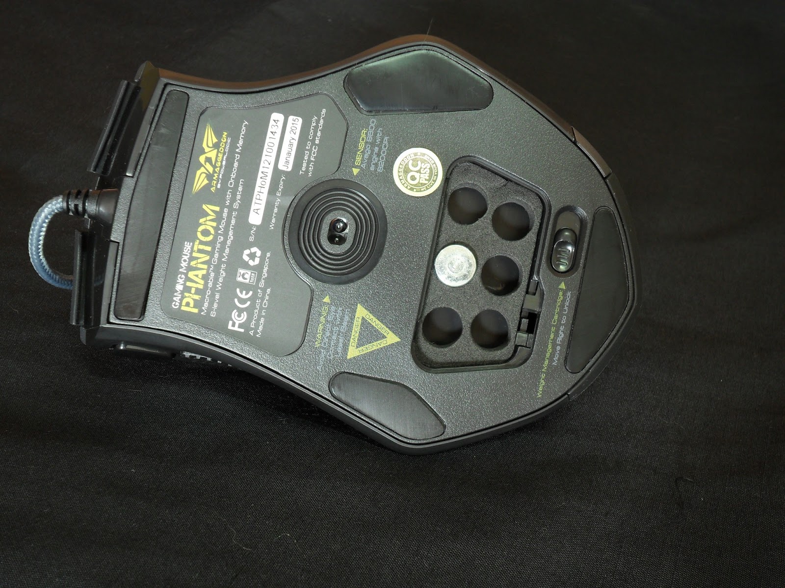 At the bottom are four Teflon feets, the Avago 9800 sensor and the access for the weight management system of the Phantom. Adding weights is an easy task, simply slide the small button to the side and the cover will slide right off, all that's left after that is to get the weights from the pillbox and insert to the corresponding slots under the mouse. There is no mention of how much each of these weight though so those of you who prefer a heavier mouse will have to feel it for yourself and taking it out is a pain as there is not much room for my fingers to get a grip on the weights.