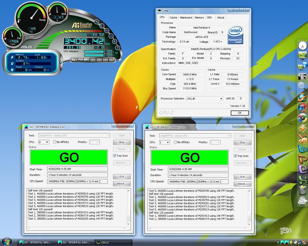 QUOTE(Jaffar @ May 1 2006, 11:18 AM) Hmm, your are not using Prime95 there right? Just now I put it on test, but didn't use 2 test at once. Will this cause error? As It return FATAL ERROR in the torture test. But bechmark is fine and quiet up to standard. that is SP2004.. http://sp2004.fre3.com/download.htmSP2004 is just an interface for Prime95... extract the file into ur prime95 installation directory.. If u run one prime test only actually u just stress one core.. If u got any error dat mean its unstable although u can pass through some 3d benchie app.. correct me if im wrong guyz..