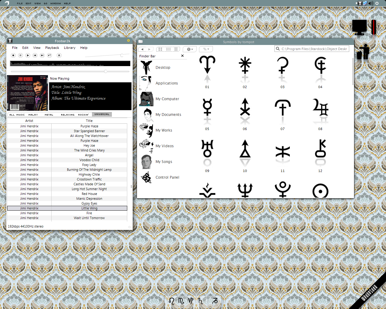 Here another of mine.. Idle Inside Miranda && Foobar = True  Wallie - morgantitan by shakeitgranny(tiled) VS - area o4 by heyloveToolbar - Cutout pack01 by aphaitsApps: - Styler - Finderbar - Avedesk - Samurize - RKlauncher