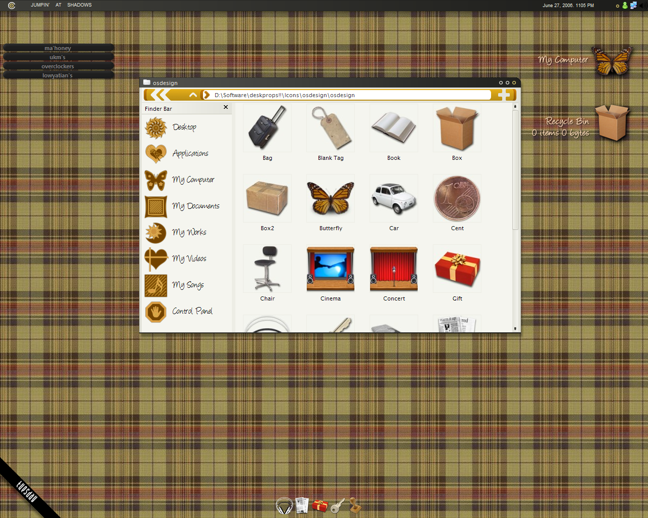 here is mine.. nothing much changed..  * Visual Style: Milk2.0 by lennard* Toolbar: Smooth Alternative by 6xgate* Wallpaper: meh by mylittlewindmill* Icons: Various(Suma,Darkness,Tribulations,MiniumDocXP,Yeti Box 2) * Programs: Styler, Avedesk, RK Launcher, Finder Bar This post has been edited by newbieockids: Jun 1 2006, 03:12 AM