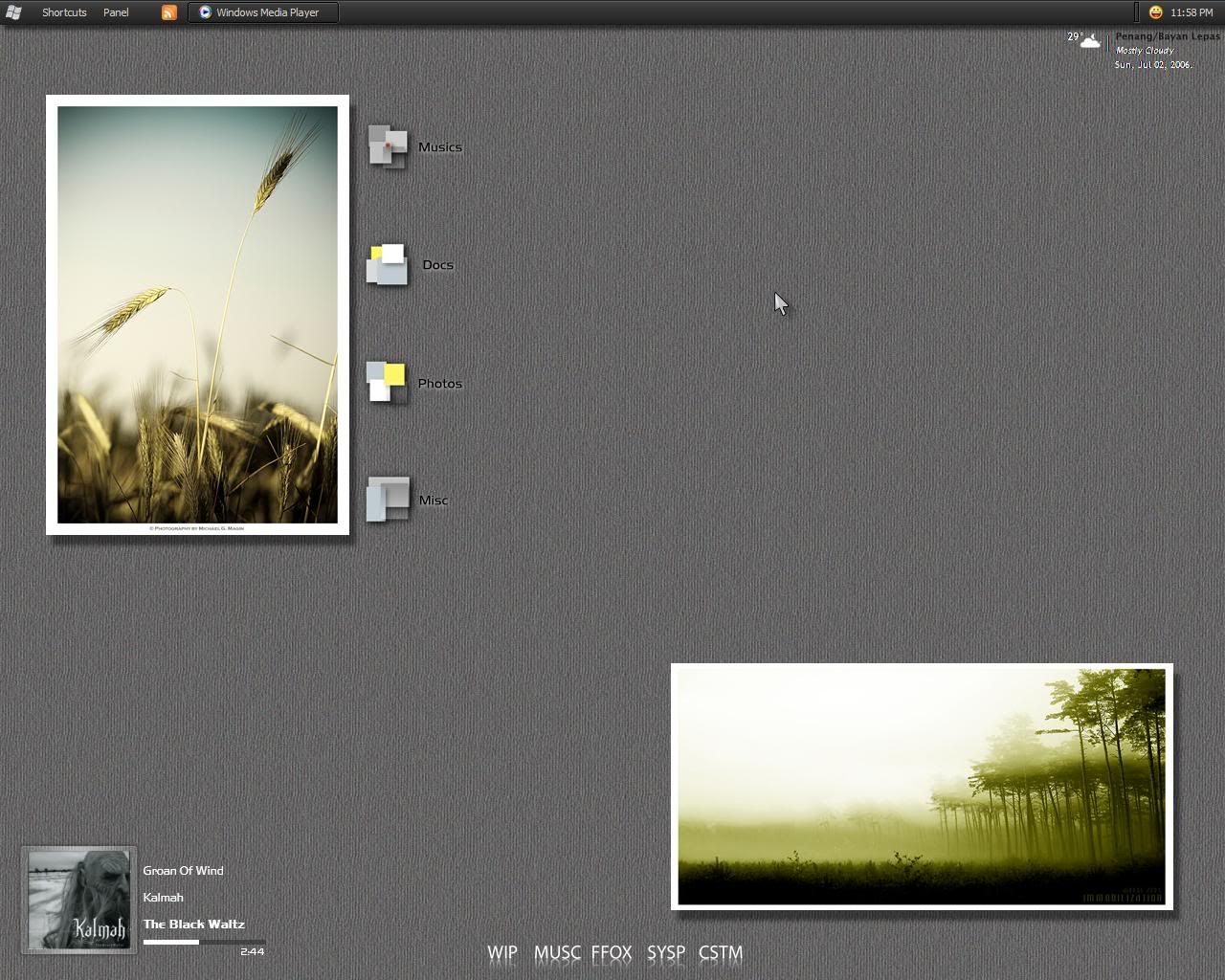 my entries for JULY.. nuthin' special * Visual Style: TiSkin * Wallpaper: Named Monkey-Faced(took sumwhere & edit) * Icons: Tango Shell * Programs: Yahoo! Widget, RK Launcher(icon forgot the name), Custome made CD-case Attached thumbnail(s)