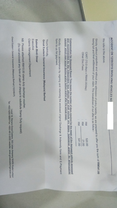 my car kena hit by motorbike, 1 week till now still waiting for that guy to bank in but i don't think he is doing that.
