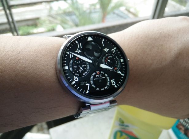 Silver Moto 360 with Pebble Steel band. Using Rolex watchface via WatchMaker app.