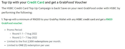 QUOTE(Atan65419 @ Aug 3 2022, 10:36 AM) <a href='https://pictr.com/images/2022/08/03/B3ZPOP.md.jpg' target='_blank'>https://pictr.com/images/2022/08/03/B3ZPOP.md.jpg </a> Hi, has anyone topped up RM200 and got the grabfood voucher? I topped yesterday but still didn't receive yet. also, how many times reward points we get if we top up grab wallet using hsbc cc? tks! Damn the top up promo already back. Nobody share about it Thanks for the heads up btw. Rm15 voucher still available..just got one This post has been edited by kernel123: Aug 3 2022, 10:47 AM