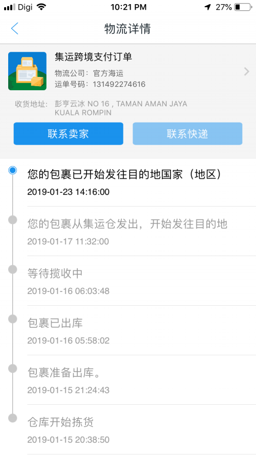 QUOTE(Zephius516 @ Jan 25 2019, 07:37 PM) Guys anyone here come across this kind of problem where taobao update stuck at the highlighted line in below image, but when ask customer service said that parcel already pass customs and currently shipping to malaysia ( i use sea shipping therefore my parcel already in the ship sailing to malaysia now as per CS reply). Shouldn't taobao update the status when the parcel pass customs before the parcel go for sea shipping cause i saw many other who post their parcel status had those line when parcel goes for customs clearance and passed clearance. It takes days for them to update when it ships from warehouse to overseas.<a href='https://pictr.com/images/2019/01/25/0exw7Q.md.png' target='_blank'>https://pictr.com/images/2019/01/25/0exw7Q.md.png </a> |