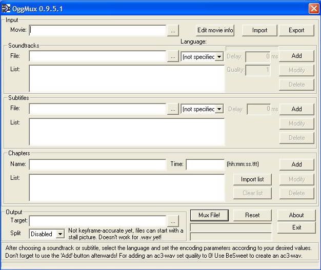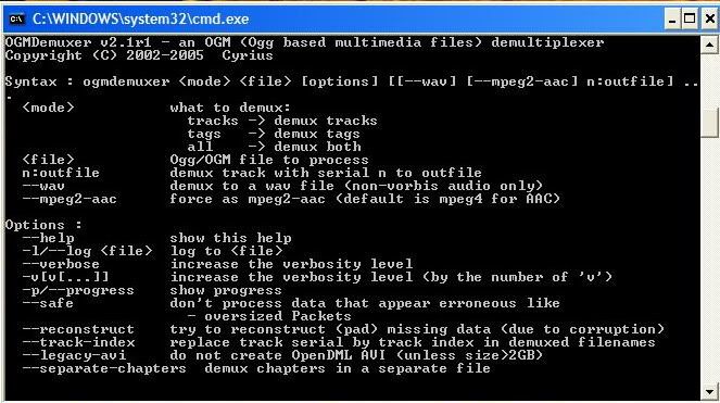 OggMux - A multiplexer for OGM containers http://oggmux.sourceforge.net/ScreenshotDownloadMovie input : *.AVI Audio Input : *.OGG, AC-3 Wave *.WAV, *.MP3, *.AAC Subtitle Input : *.SRT only Please ensure that you have Ogg Subtitle Mixer and Ogg DirectShow Filters in order to play/display the file.Those files can be found at http://www.free-codecs.com/OGMDemuxer - Demux stream from OGM fileOGMDemuxer (command line) is a basic demultiplexer that allow you to demux streams from an OGM file. It automatically creates an AVI file for a video stream, an Ogg file for an Ogg Vorbis stream, an SRT file for subtitles, ... Latest versions also allow you to demux the comments of each stream.If you lazy to use command line, just drag & drop file.It automatically demux all stream. http://ogmtools.corecodec.org/ogmtools.htmlScreenshotDownloadThis post has been edited by keyz: Jul 5 2005, 01:23 PM