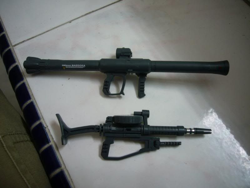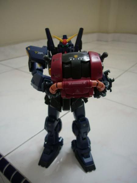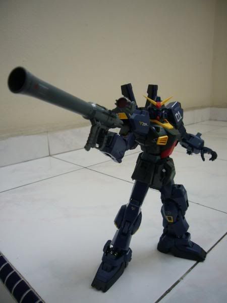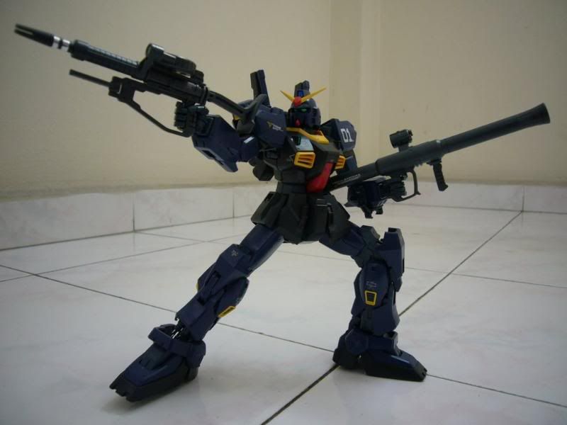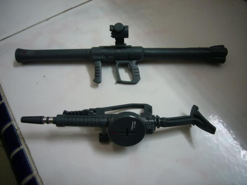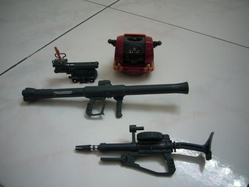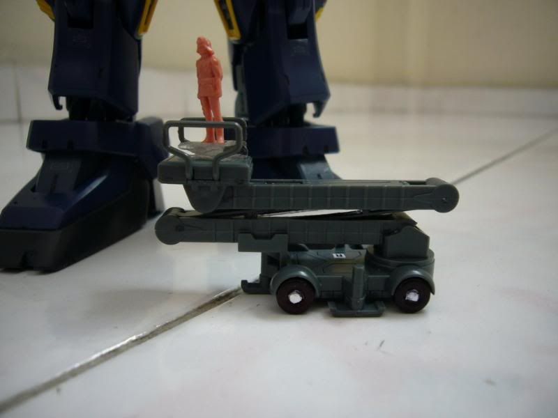 Time to show off my Zaku... just finished the top half of the torso and arms, but haven't take pictures yet. Here's some pics of the weapons and the incomplete torso. In order not to burst the page, I'll post the links instead. http://img.photobucket.com/albums/v245/Sta.../Image00016.jpgWeapons: http://img.photobucket.com/albums/v245/Sta.../Image00007.jpghttp://img.photobucket.com/albums/v245/Sta.../Image00006.jpgAdded some minor details, panel lines, and decals. MKII showing off the Zaku's weapons. They don't really fit well with the MKII as the weapons keep hitting the MKII's armour. http://img.photobucket.com/albums/v245/Sta.../Image00001.jpghttp://img.photobucket.com/albums/v245/Sta.../Image00002.jpghttp://img.photobucket.com/albums/v245/Sta.../Image00005.jpghttp://img.photobucket.com/albums/v245/Sta.../Image00009.jpgThe bazooka looks like a flintlock pistol when the rear tube is removed.  MKII carrying the Zaku torso: http://img.photobucket.com/albums/v245/Sta.../Image00014.jpghttp://img.photobucket.com/albums/v245/Sta.../Image00015.jpgChar checking out the MKII: http://img.photobucket.com/albums/v245/Sta.../Image00013.jpghttp://img.photobucket.com/albums/v245/Sta.../Image00010.jpghttp://img.photobucket.com/albums/v245/Sta.../Image00012.jpgAdded some silver to the hydraulics of the lift, and also coloured the wheels. Going to post more pics soon, after I apply decals to the right shoulder armour. Hopefully can finish the hip and skirt armours tomorrow.