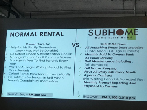 I attended a short seminar organised by a company called Subhome Management Sdn Bhd, who are offering to provide Airbnb/hotel style property management services for a 40% cut of revenue sharing per month. According to them, we, the landlords, will pay for the cost of furnishing the units and upon completion, they will advertise the unit for rent on sites like agoda.com and booking.com etc.