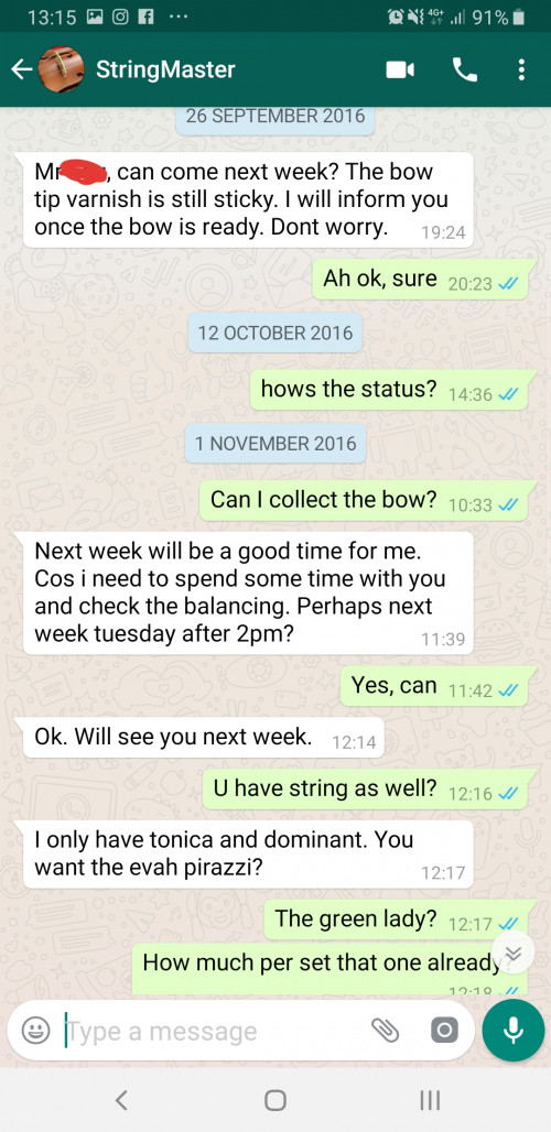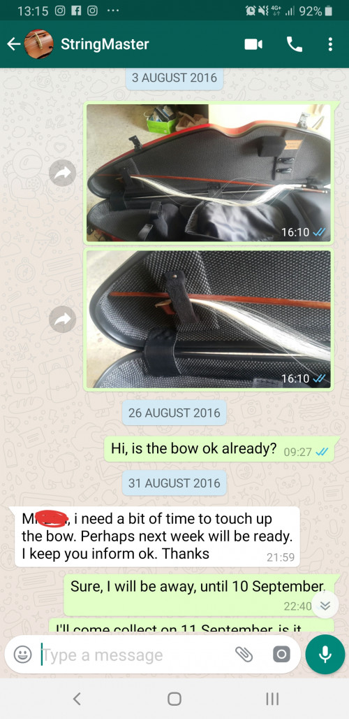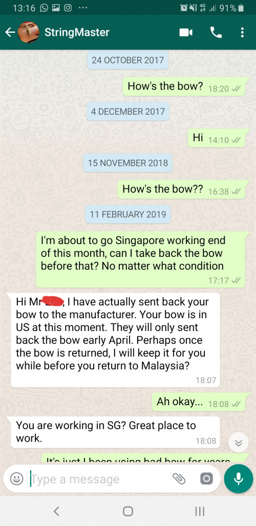 I bought the expensive bow and violin from that shop, I asked other shop, in Singapore, Taiwan, they said my violin not German make but China make, and the price too high. And this expensive bow, just only 2 months then the tip broken, I asked them to repair, after 4 months, broken again, (the boss said he studies violin makeing in Germany blah blah blah), and now, after 3 years, the bow still at his shop, so many excuses. I don't think I'm able to get back the bow, so I as well as just warn everyone. [url=https://pictr.com/image/5PHCRn] https://pictr.com/images/2019/05/31/5PHCRn.md.jpg [/url] https://pictr.com/images/2019/05/31/5PHTrB.md.jpg https://pictr.com/images/2019/05/31/5PHcYc.md.jpg https://pictr.com/images/2019/05/31/5PHeKG.md.jpg |