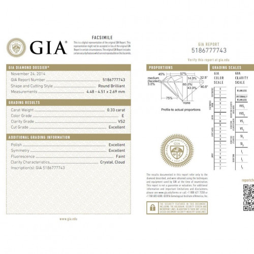 Item(s):GIA Diamond 0.33ct, E color, VS2 clarity, Excellent Cut/Polish/Symmetry