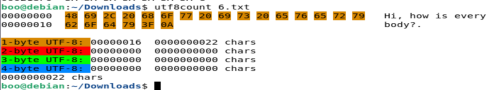 ![]() (3.txt is a text file containing Thai scripts) From the screenshot, you likely to notice two hexdump command. They are different. /usr/bin/hexdump - Comes with Linux /usr/local/bin/hexdump - My own "hexdump" written in Assembly language, compiled with fasm and copied to that folder /usr/local/bin/utf8count - A special file utility calculating the number of UTF-8 characters in a text file If you want a handy program to calculate UTF-8 chars in a text file, consider my utf8count.asm! Please compile with flat assembler. It targets Linux x64. (No Windows version is available at the moment) Use utf8count to analyze 1.txt (containing Chinese characters): ![]() Use utf8count to analyze 2.txt (containing Arabic characters): ![]() Use utf8count to analyze 4.txt (containing Emoji, most are 4-byte UTF8): ![]() Use utf8count to analyze 5.txt (containing Tamil script): QUOTE நீங்கள் எப்படி இருக்கிறீர்கள்? ![]() Limitation: -This app doesn't check for invalid UTF-8 sequence -No support for byte order mark (BOM) -Analyzing binary file will definitely give wrong character count as binary file is not text file This post has been edited by FlierMate1: Aug 18 2022, 06:14 PM Attached File(s)