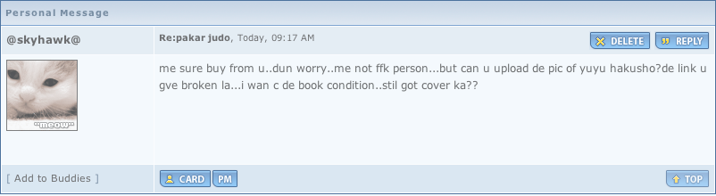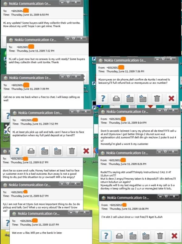 then time pass reach 25th where the item already reach my hand i ask him again at msn reminded him again to pay up the item he order as well going to deliver the item to him but he reply and said another excuse where his salary delay to 3rd of march and promise to pay me.