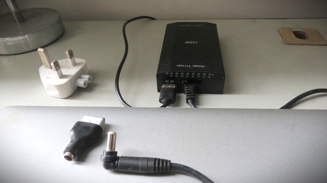 It has 12V input for car cigarrette port which allow you to charge your macbook in the car.