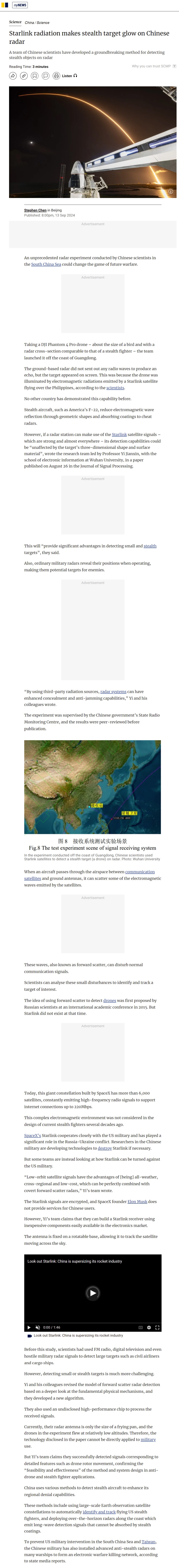 Starlink radiation makes stealth target glow on Chinese radar A team of Chinese scientists have developed a groundbreaking method for detecting stealth objects on radar Chinese scientists have used the network of Starlink satellites to detect a stealth target on radar. Pictured is a SpaceX Falcon 9 rocket carrying 21 Starlink satellites. Published: 8:00pm, 13 Sep 2024 An unprecedented radar experiment conducted by Chinese scientists in the South China Sea could change the game of future warfare. Taking a DJI Phantom 4 Pro drone – about the size of a bird and with a radar cross-section comparable to that of a stealth fighter – the team launched it off the coast of Guangdong. The ground-based radar did not sent out any radio waves to produce an echo, but the target appeared on screen. This was because the drone was illuminated by electromagnetic radiations emitted by a Starlink satellite flying over the Philippines, according to the scientists. No other country has demonstrated this capability before. Stealth aircraft, such as America’s F-22, reduce electromagnetic wave reflection through geometric shapes and absorbing coatings to cheat radars. |