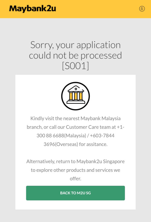 Maybank SG website has a site for Malaysians to open accounts, and I selected the iSAVvy account but this error appeared. Want to know if anyone else also received this error and if so what they have done to successfully open a Maybank account in SG, or how to open a Maybank account in SG as a Malaysian in general.