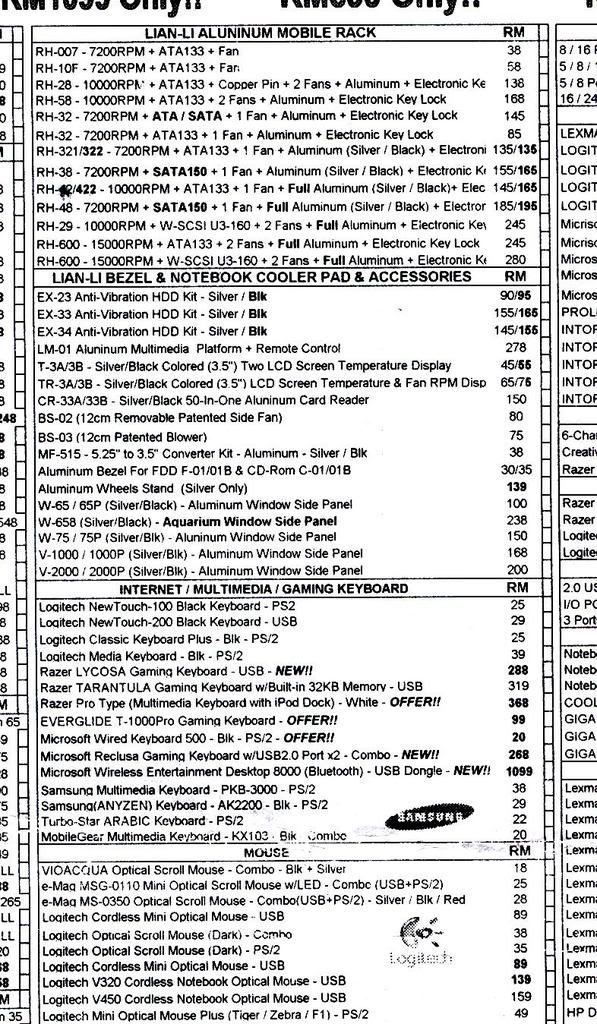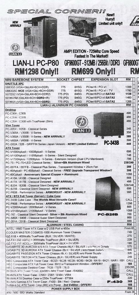 QUOTE(GuyzNexDoor @ Apr 16 2008, 06:58 AM) Price list for Lian Li product at ATE shop for the month of April 2008. wtf I juz zoom to the Lian Li part only... http://i107.photobucket.com/albums/m313/guyznexdoor/Scan10004.jpg http://i107.photobucket.com/albums/m313/guyznexdoor/Scan10005.jpg with the price like dat better grab TJ-07 QUOTE(wiNd @ Apr 16 2008, 06:20 PM) A17B is a better choiceA10B, some previous owners experienced bad cooling performance on this case |